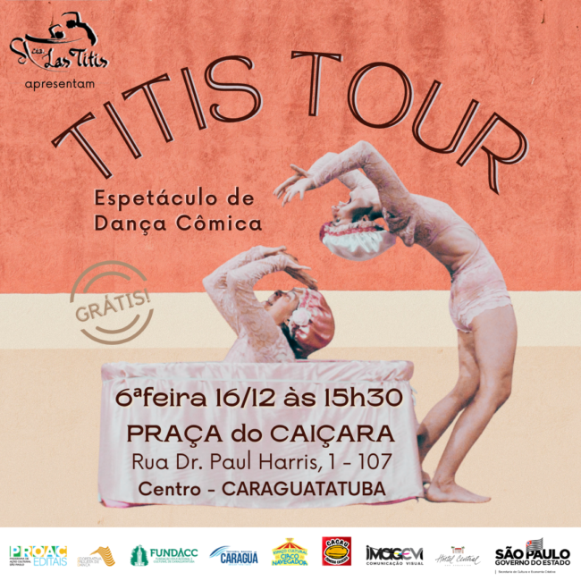 Espetáculo de Dança Cômica TITIS TOUR da cia. LAS TITIS Um espetáculo pra família toda se divertir com a gente! Em cena, duas velhas amigas navegam pelo mundo em uma banheira mágica. Embarcadas em seus próprios sonhos, fazem uma pausa para um banho que se transforma em um périplo de coreografias improváveis Entre um mergulho…