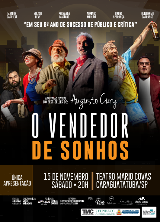 O espetáculo ‘O Vendedor de Sonhos’, adaptado do livro best-seller de Augusto Cury, chega à Caraguatatuba na próxima semana. A peça, que já emocionou milhares de espectadores pelo Brasil, será apresentada no dia 15/11 (sábado), às 20h, no Teatro Mario Covas. Os ingressos custam entre R$ 50 e R$ 120 e podem ser adquiridos antecipadamente pelo link https://tinyurl.com/68epy3mc ou na livraria Reticências, localizada na Rua Padre Anchieta, nº 556, no Centro.