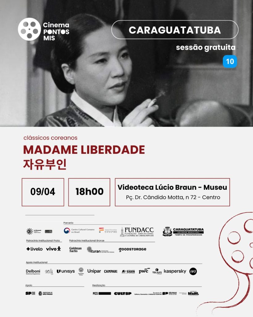 O projeto Cineclube Pontos MIS exibe nesta quinta-feira (9/4), às 18h, na Videoteca Lúcio Braun, em Caraguatatuba, o filme “Madame Liberdade”, dirigido por Han Hyeong-mo. A entrada é gratuita e não é necessário retirar ingresso com antecedência.