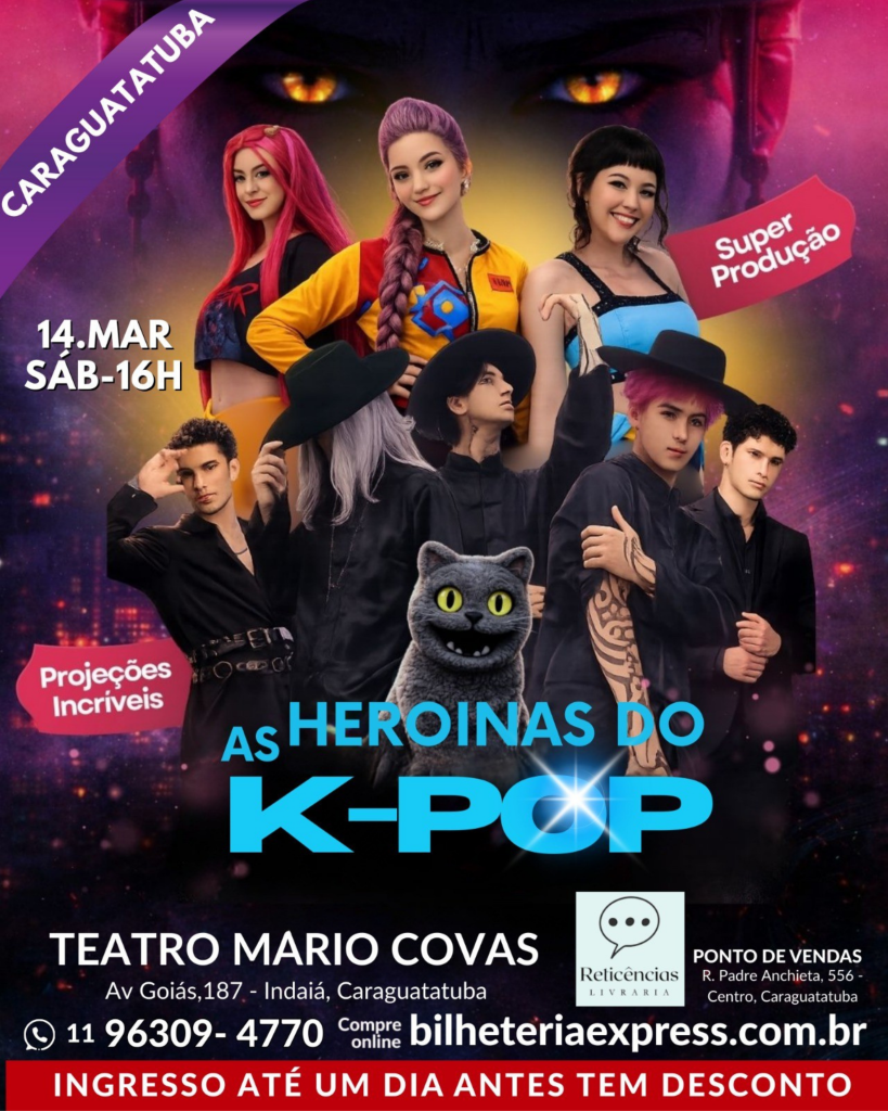 O Teatro Mario Covas, em Caraguatatuba, apresenta neste sábado (14/3), às 16h, o espetáculo musical infanto-juvenil “As Heroínas do K-Pop”, com autoria e direção de Ramon Materazzo. Os ingressos custam entre R$ 35 e R$ 70 e podem ser adquiridos na Bilheteria Rápida, através do link https://tinyurl.com/4xbd2xam, ou presencialmente na Reticências Livraria, situada na Rua Padre Anchieta, nº 556, no Centro.