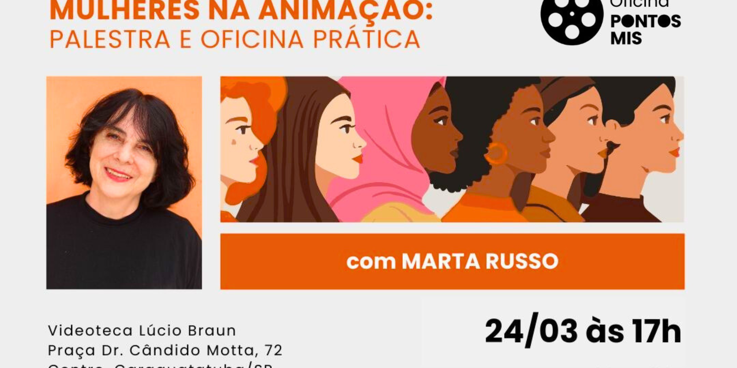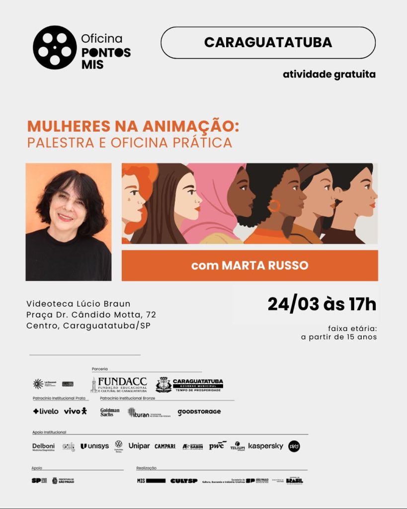 O programa Pontos MIS realiza a palestra e oficina audiovisual “Mulheres na Animação”, ministradas por Marta Russo, no dia 24/3 (terça-feira), das 17h às 21h, na Videoteca Lúcio Braun, em Caraguatatuba. A iniciativa é do Museu da Imagem e Som de São Paulo (MIS), em parceria com a Fundação Educacional e Cultural de Caraguatatuba (Fundacc). As atividades são gratuitas e a inscrição deve ser realizada através do link https://tinyurl.com/yyumfkjn