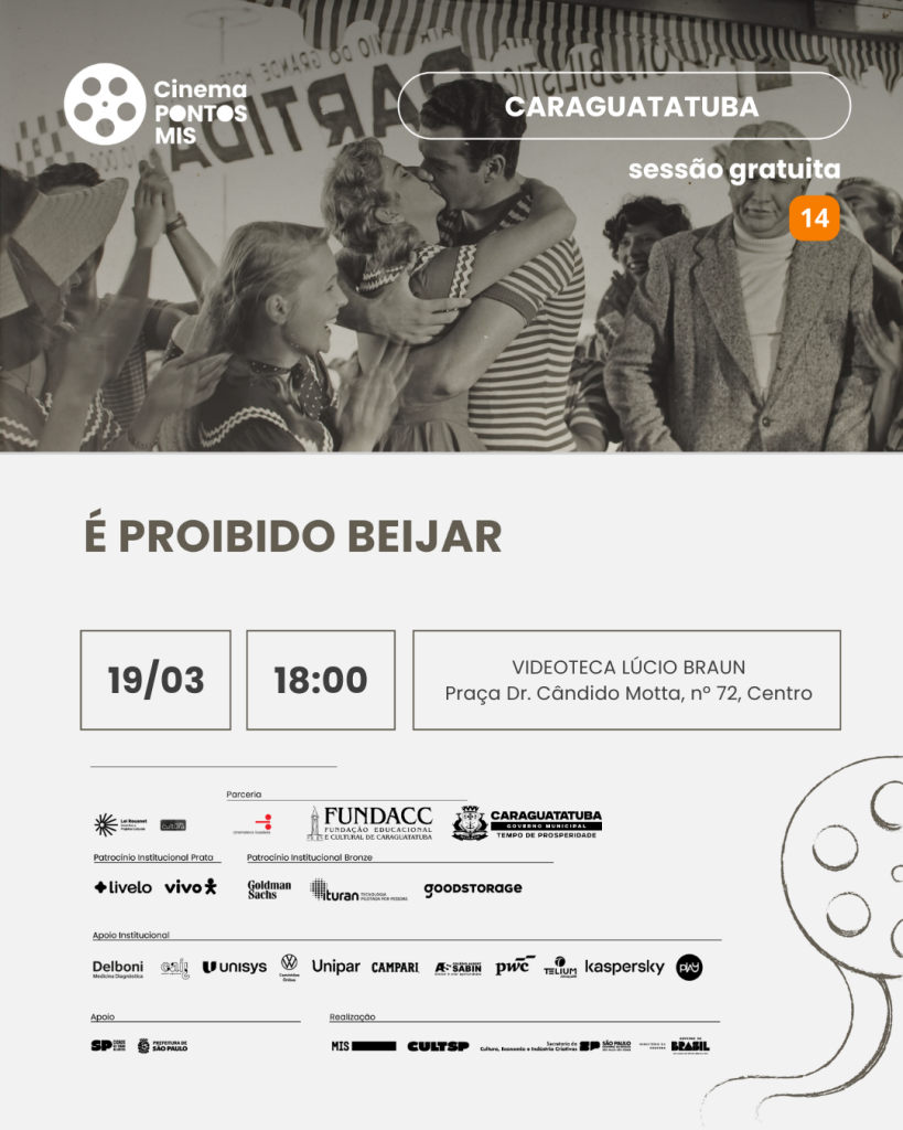 O projeto Cineclube Pontos MIS exibe nesta quinta-feira (19/3), às 18h, na Videoteca Lúcio Braun, em Caraguatatuba, o filme “É Proibido Beijar”, produzido em 1954 pela Companhia Cinematográfica Vera Cruz. A entrada é gratuita e não é necessário retirar o ingresso com antecedência.