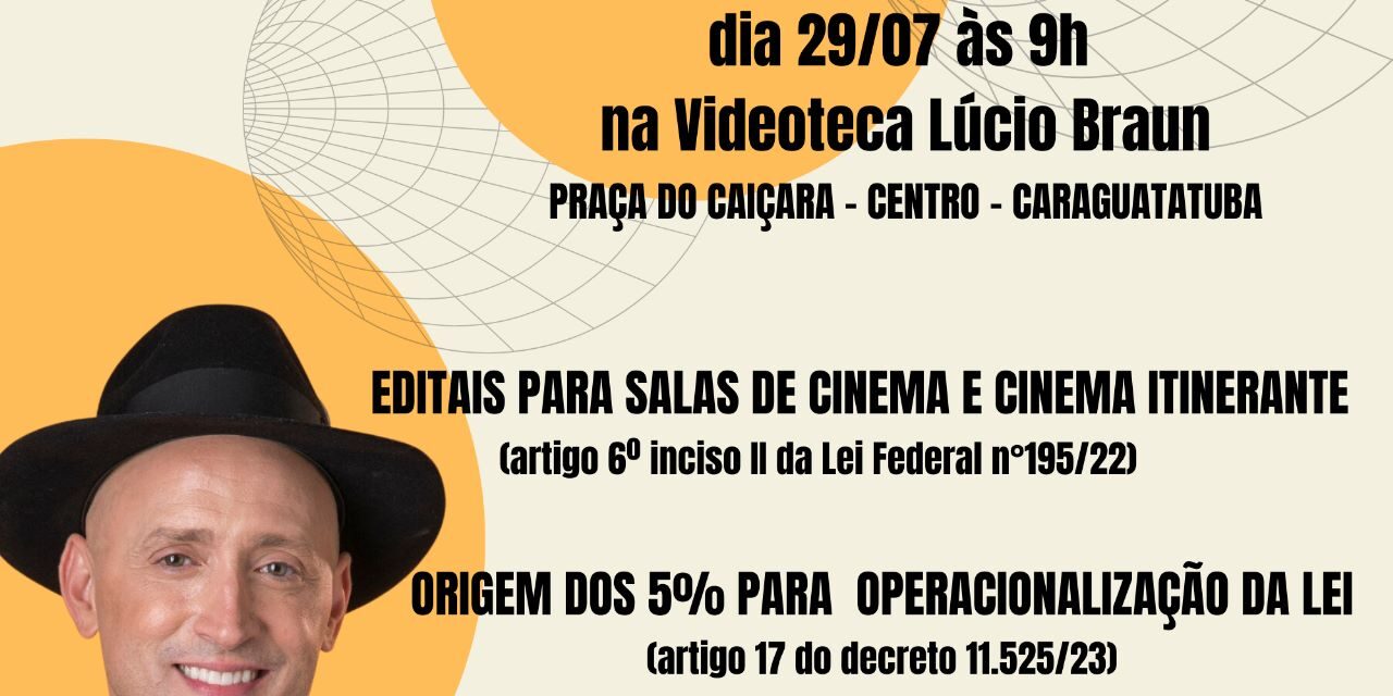 Na pauta, os editais para salas de cinema e cinema itinerante (artigo 6º inciso II da Lei Federal nº195/22) e origem dos 5% para operacionalização da Lei (artigo 17 do decreto 11.525/23).
