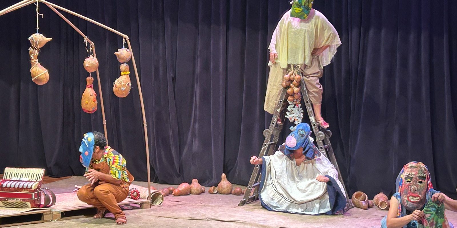 Em “Caruru – Teatro-Bailinho”, os festejos populares é o lugar de encontro das crianças onde da cabaça se faz um mundo ressignificado e cheio de encantamentos. Na peça, a festa de Cosme e Damião convida o público a festejar, dançar, comer e a se “acriançar” dentro do grande Teatro-Baile-Criança.