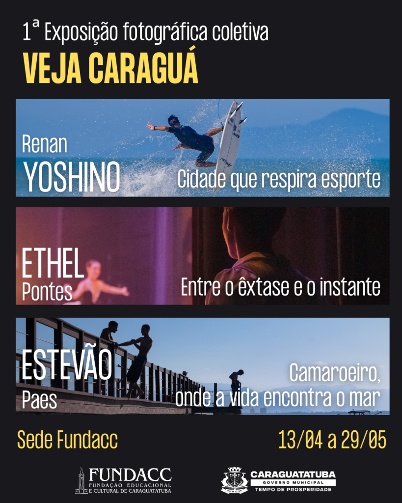 A exposição apresenta ao público o resultado do Prêmio Fotográfico Veja Caraguá 2025, iniciativa que convidou moradores do município a registrarem diferentes aspectos do cotidiano da cidade. A mostra reúne as fotografias premiadas e inclui também três séries individuais dos fotógrafos vencedores – Renan Yoshino, Ethel Pontes e Estevão Paes – que, por meio de linguagens e interesses distintos, constroem narrativas visuais sobre a cidade.