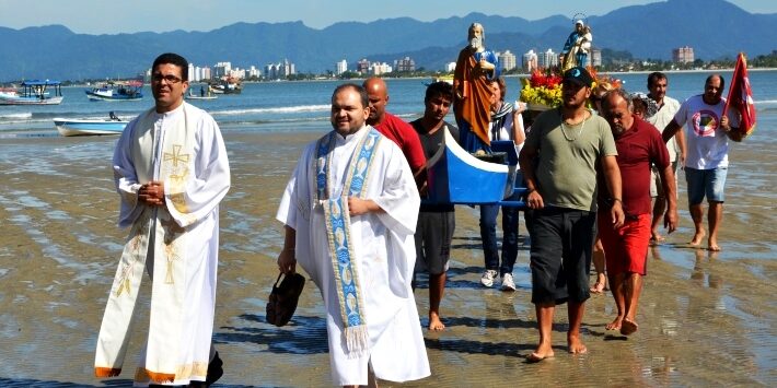 Em seguida, haverá a procissão terrestre, novamente com os fieis carregando o andor com as imagens de São Pedro Pescador e de Nossa Senhora dos Navegantes. A Banda Municipal Carlos Gomes acompanha todo o cortejo a pé.